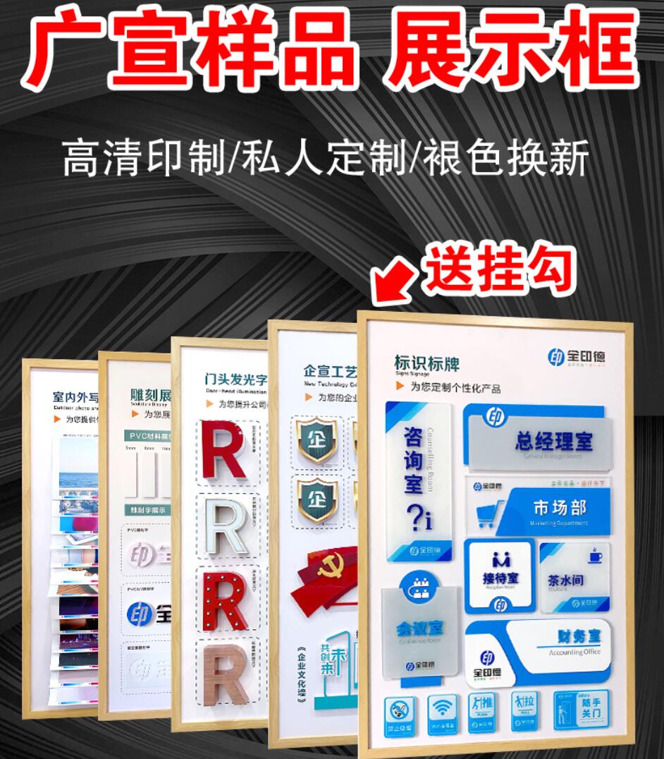5块为一套,包含:1、企宣UV工期展示;2、广宣雕刻材料展示;3、标识标牌工艺展示;4、户外喷绘材料展示;5、门头亮化发光字展示;企宣UV工艺材料展示部分和门头发光字部分是可摘卸设计;